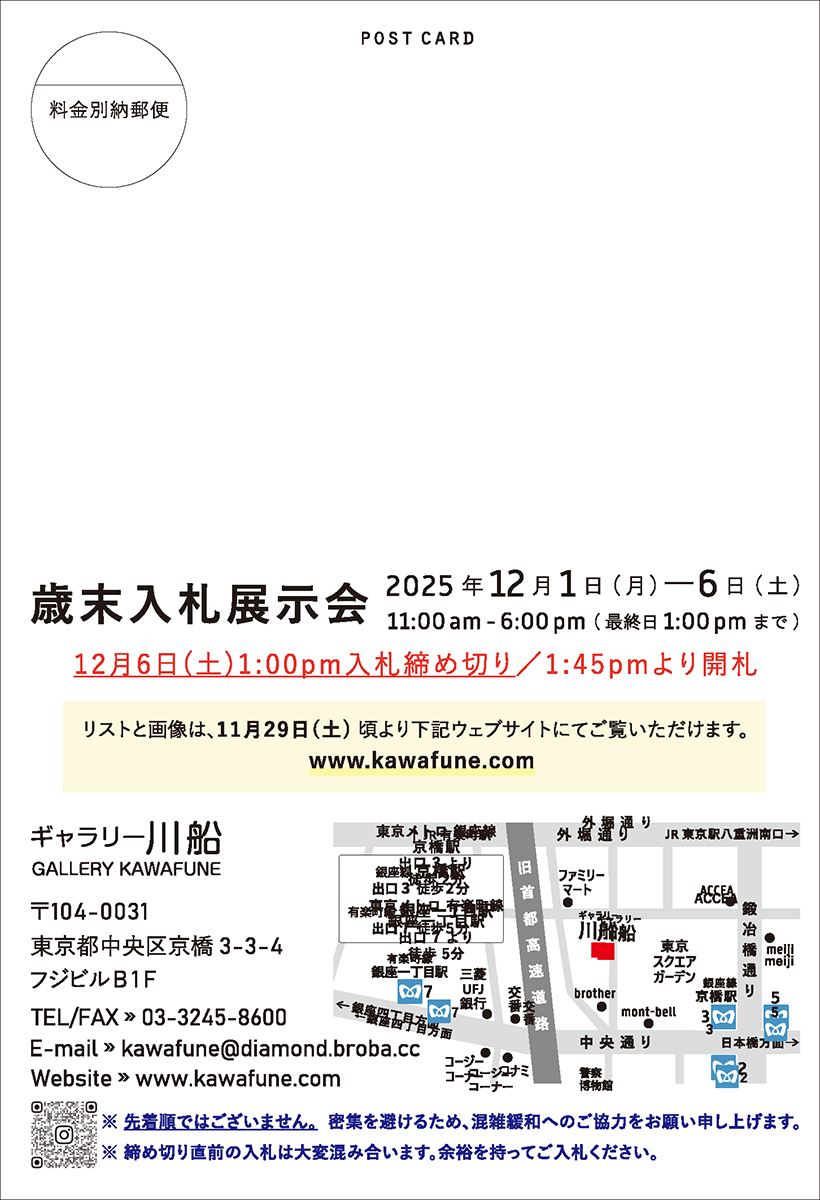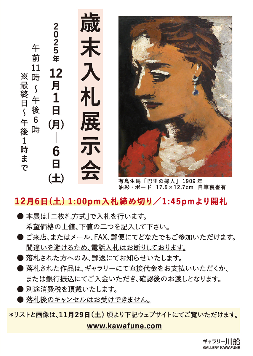 ● 落札された作品は、ギャラリー川船にて直接お支払いいただくか、お振込みいただき、ご入金確認後、