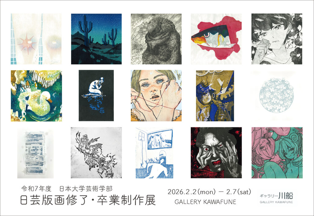 冬期休廊のお知らせ 誠に勝手ながら、ギャラリー川船は、2025年12月28日(日)から2026年1月7日(水)まで冬期休廊いたします。休み明けは1月8日(木)より営業いたします。ご不便をおかけいたしますがどうぞよろしくお願いいたします。 We will be closed for winter holidays from 28th December 2025 to 7th January 2026. 《次回展覧会》日芸版画 修了・卒業制作展 2026.2.2 (mon.) – 7(sat.)